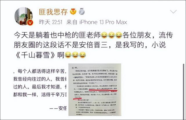 匪我思存早就已经发文表示:“匪老师躺着也中枪,这段话不是安倍说的,是我的小说《千山暮雪》里的。”