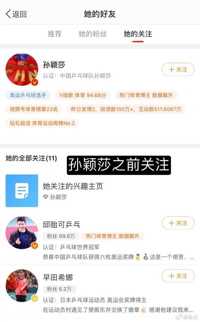 8月14日,孙颖莎和樊振东社媒最新关注列表显示,两人已经取关日本乒乓球运动员早田希娜。