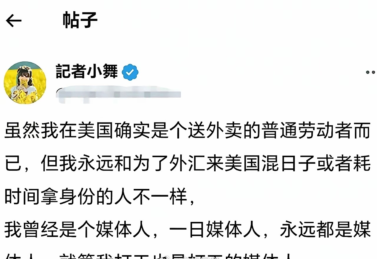倘若人间真有“自取其辱”四个字的活体标本,那非“记者小舞”莫属。这位昔日以“独立记者”自居、实则靠卖国情绪饭吃的女人,如今在美国街头连外卖都送不明白,却仍妄想用她那副被自由主义泡烂的舌头,舔舐故土同胞的怜悯——可惜,没人再愿意闻她身上那股又酸又馊的“润人味”。